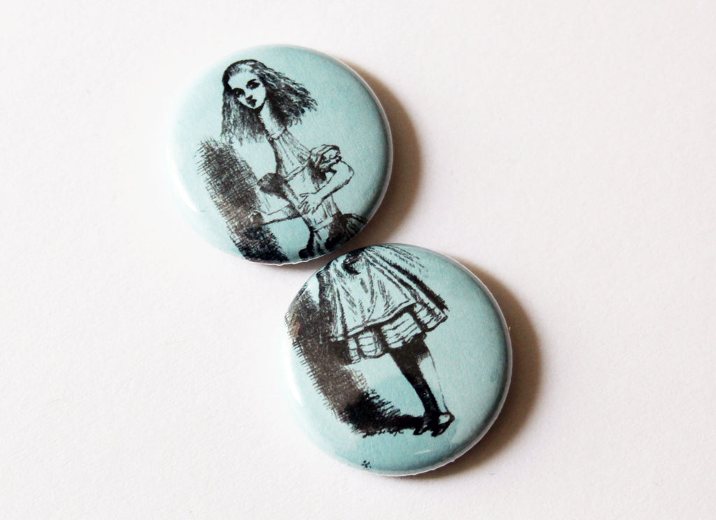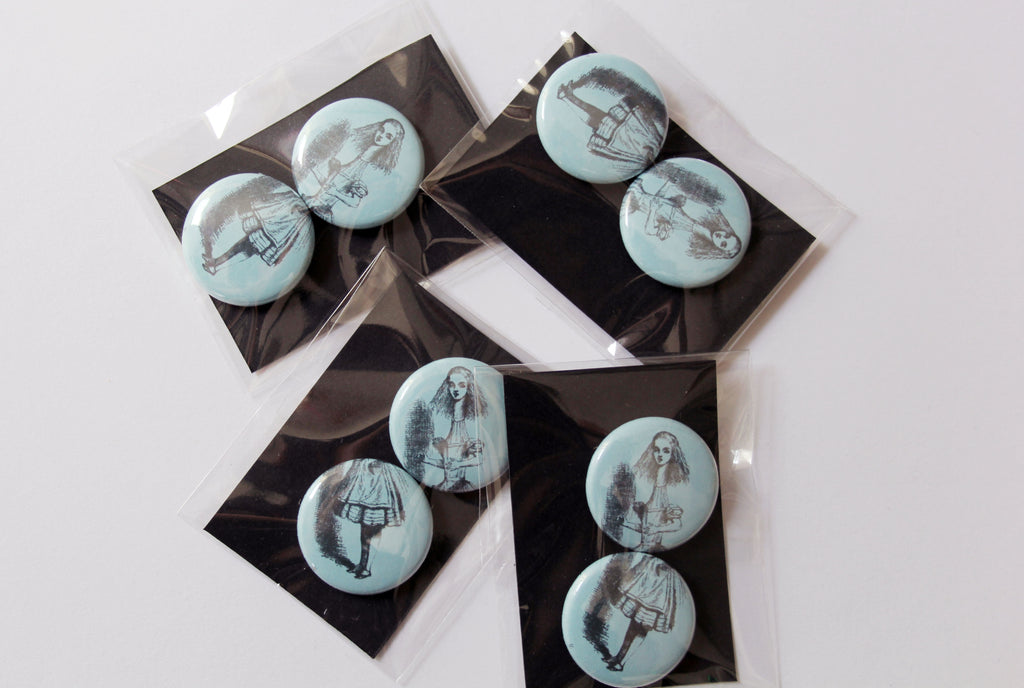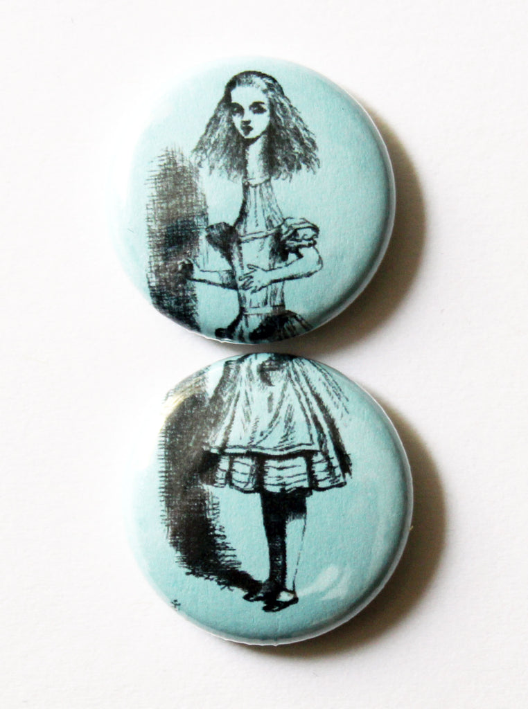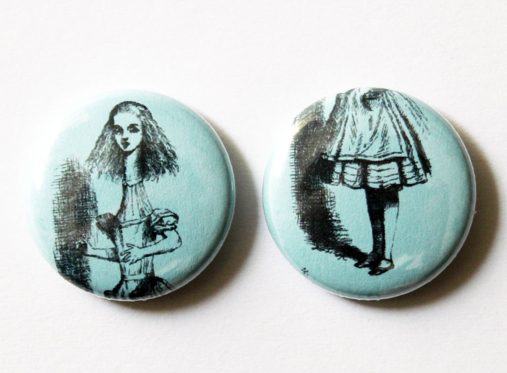 Add a touch of magic to your day with the Tall Alice One Inch Button Set. Inspired by the whimsical world of Alice in Wonderland. Included is both buttons, so you will get both halves of tall Alice.