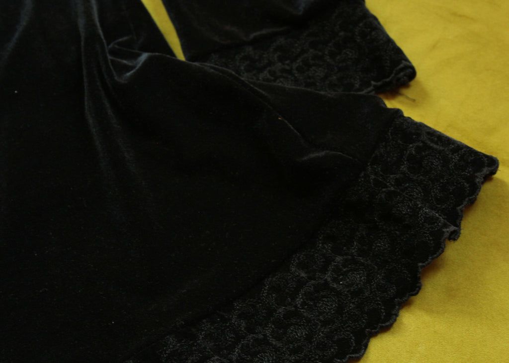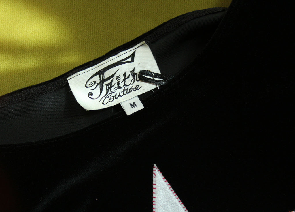 Inspired by Billy Corgan's Zero shirt! Big silver embroidered star patch affixed to the front, reinforced with bright red thread. Up cycled 90's velvet dress with lacey trim on the bottom and sleeves. The tag is to die for. A truly unique piece!