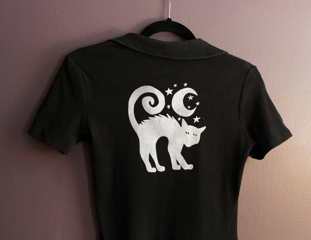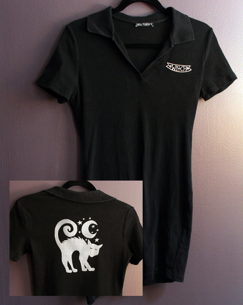 Up cycled polo dress featuring my witchy cat screen printed on the back and my witch patch affixed to the front. Perfect for the goth club (not the golf club)